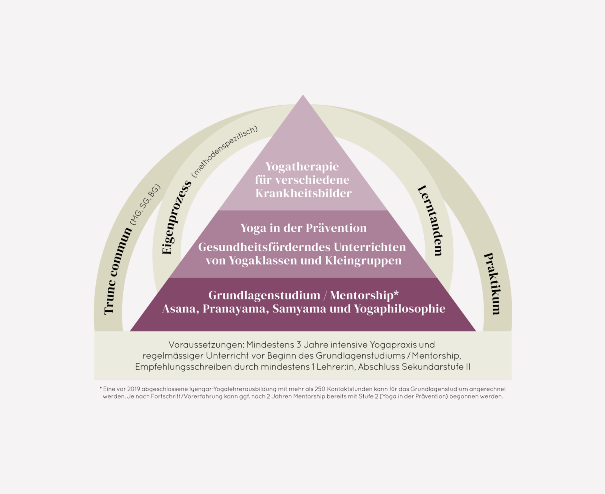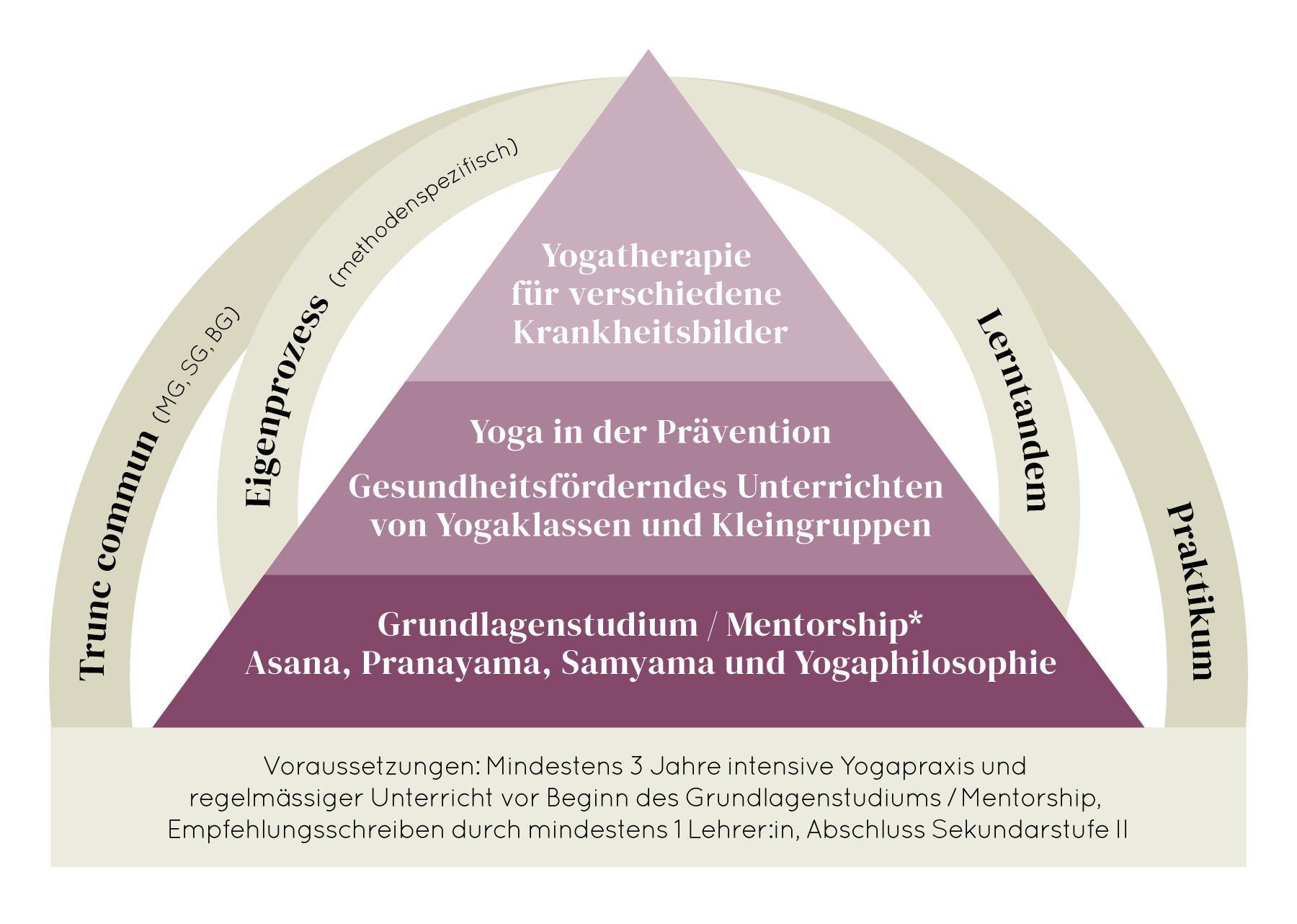 Die Grundlagenausbildung umfasst u.a. intensives Studium von Asanas, Pranayama, Samyama, Yogaphilosophie und Basiswissen für Yoga-Anatomie und dauert zwei- bis drei Jahre.