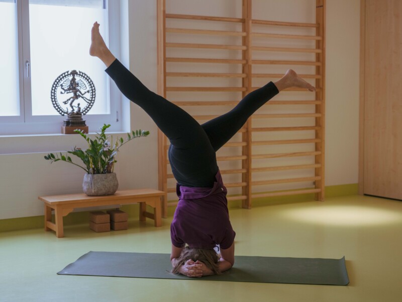 Auch die Umkehrstellungen und Pranayama werden regelmässig geübt. Kopfstand und Schulterstand mit Unterstützung sollten idealerweise bereits beherrscht werden. Es ist möglich, am Unterricht auch online teilzunehmen.